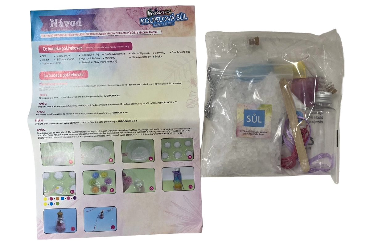 - Surowce: sól, soda oczyszczona, olejek eteryczny, barwne proszki