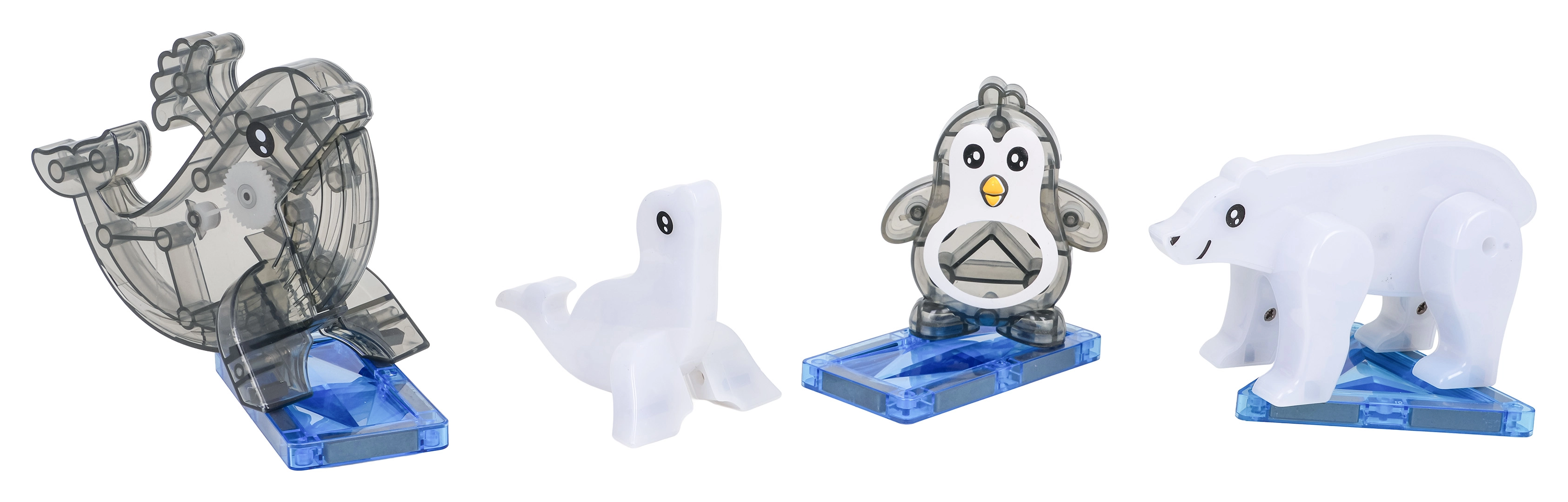 Figurki mają ruchome elementy (delfin otwiera pysk, niedźwiedź porusza nogami, pingwin podnosi i opuszcza płetwy), co wspiera fantazyjne opowieści i małą motorykę. Elementy można łączyć pod różnymi kątami i tworzyć nieograniczone wariacje konstrukcji – od prostych kształtów po złożone modele 3D.