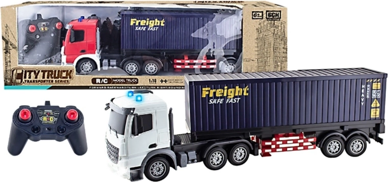 Model w skali 1:18 posiada regulację zbieżności kół dla precyzyjniejszego sterowania oraz ruchome elementy naczepy, które urozmaicą zabawę. Pojazd jest zasilany dołączonym akumulatorem 3,7 V, a pilot wymaga 2× baterii AA (brak w zestawie).