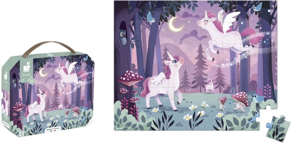 Magiczna układanka dla małych miłośników bajek: puzzle w praktycznej walizeczce z motywem jednorożców i 54 solidnymi elementami. Idealne do domu i w podróż, z plakatową podkładką ułatwiającą układanie oraz docelowym wymiarem ok. 50 × 40 cm.