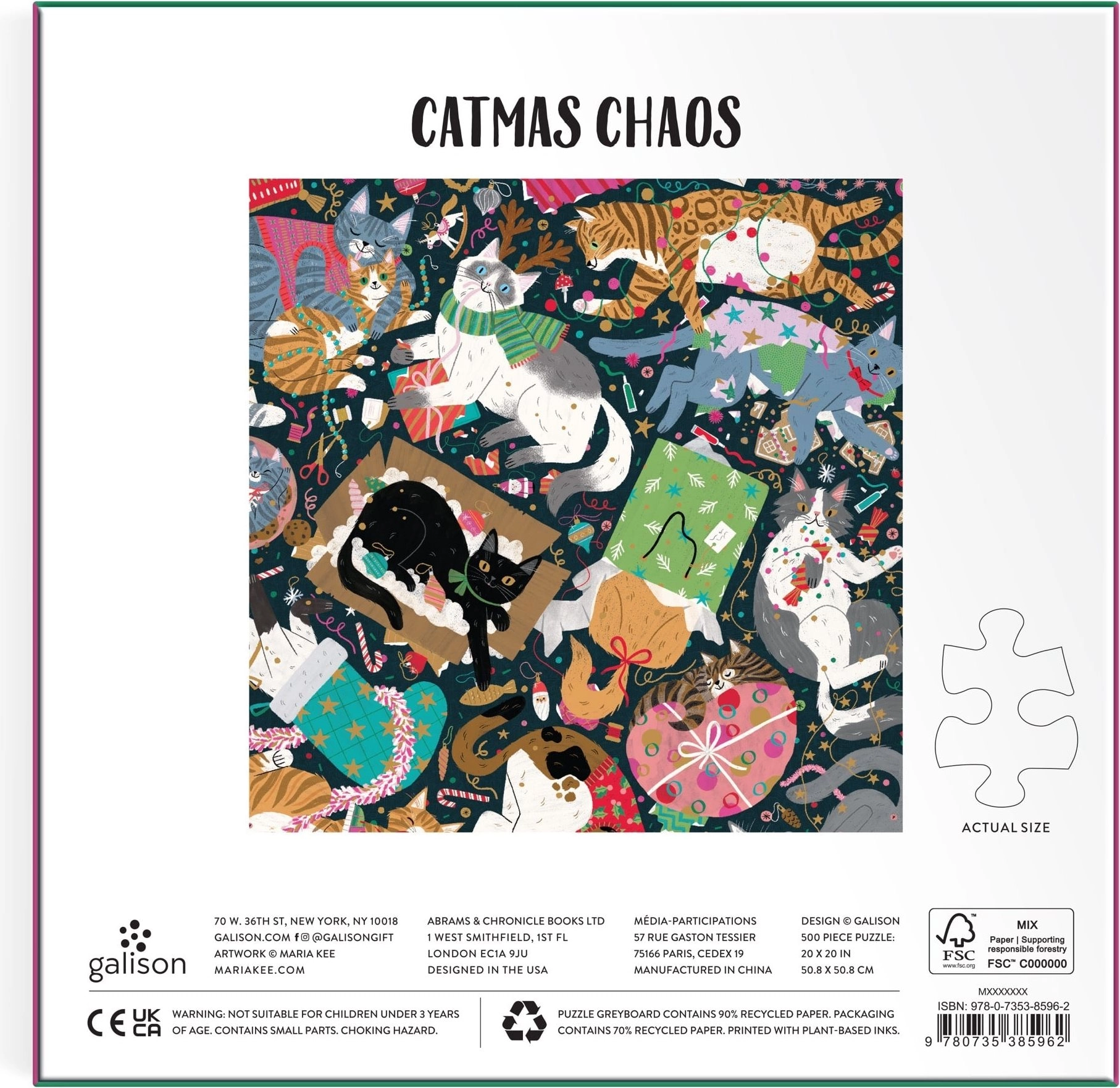 Ciesz się układaniem z eleganckimi metalicznymi efektami: kwadratowe puzzle z motywem kociego świątecznego chaosu oferują 500 elementów, wysoką jakość wykonania oraz arkusz z wzorem w zestawie. Gotowy obraz ma wymiary 50,8 × 50,8 cm i doskonale sprawdzi się jako dekoracja lub prezent dla miłośników kotów i Świąt.