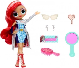 Lalka z ruchomymi stawami, długimi włosami, wyrazistymi okularami i srebrnymi elementami garderoby do kreatywnej zabawy i zdjęć.