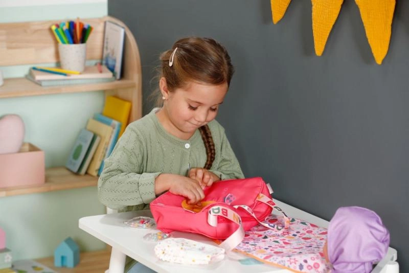 Dzięki przypinanym ozdobom dzieci dopasują torbę do swojego nastroju – wspierając kreatywność, motorykę małą i troskę o innych. Zestaw zawiera składaną matę do przewijania dla wygodnego przewijania w dowolnym miejscu, pieluszkę oraz drobne dodatki, takie jak pojemnik na puder i pudełko na niezbędniki.