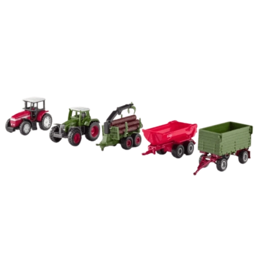 Ten wszechstronny zestaw Siku Farmer dostarcza autentycznych wrażeń ze świata maszyn rolniczych. Znajdziesz w nim traktor MASSEY FERGUSON 9240, traktor FENDT FAVORIT 926, leśną przyczepę z obrotowym i wychylnym żurawiem załadunkowym, czerwony wywrotkę KRAMPE oraz dwuosiową przyczepę. Precyzyjne wykonanie i funkcjonalne detale wspierają kreatywną zabawę i rozwój motoryki.