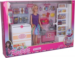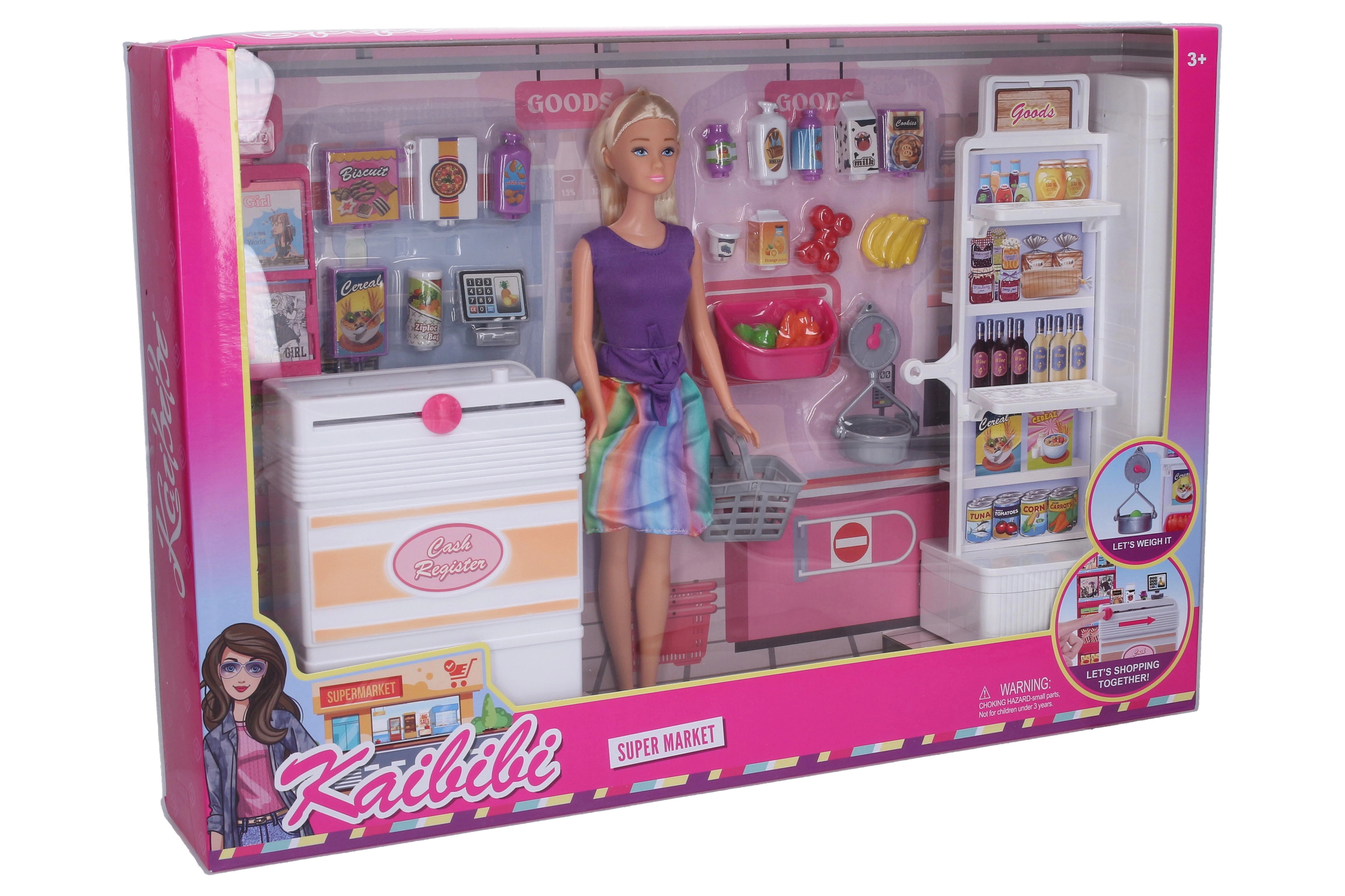 Lalka, regał na towary, artykuły spożywcze i inne produkty, kasa z taśmą, koszyk na zakupy, dodatkowe akcesoria