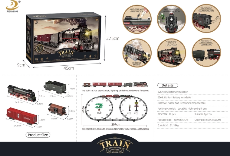 Wyrusz w nostalgiczną podróż z retro pociągiem, który zapewnia wrażenia jak na prawdziwej kolei. Lokomotywa podczas jazdy wypuszcza dym z komina i bocznych otworów (wystarczy uzupełnić wodę dołączoną pipetą), przedni reflektor świeci, a towarzyszą temu autentyczne dźwięki. Tory są solidne, bezpieczne i bardzo łatwe do połączenia.