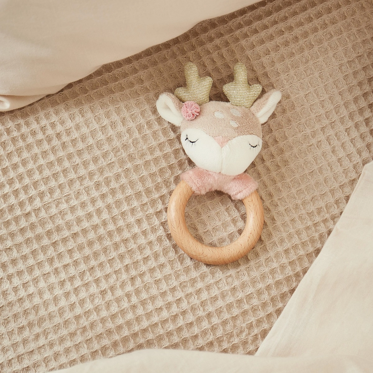Urocza grzechotka i gryzak w jednym z motywem jelonka Ella łączy drewniane kółko dla łatwego chwytania, delikatne grzechotanie dla stymulacji słuchu oraz bezpieczny gryzak przynoszący ulgę podczas ząbkowania. Naturalne drewno i miękki plusz wspierają rozwój zmysłów i małej motoryki niemowlęcia.