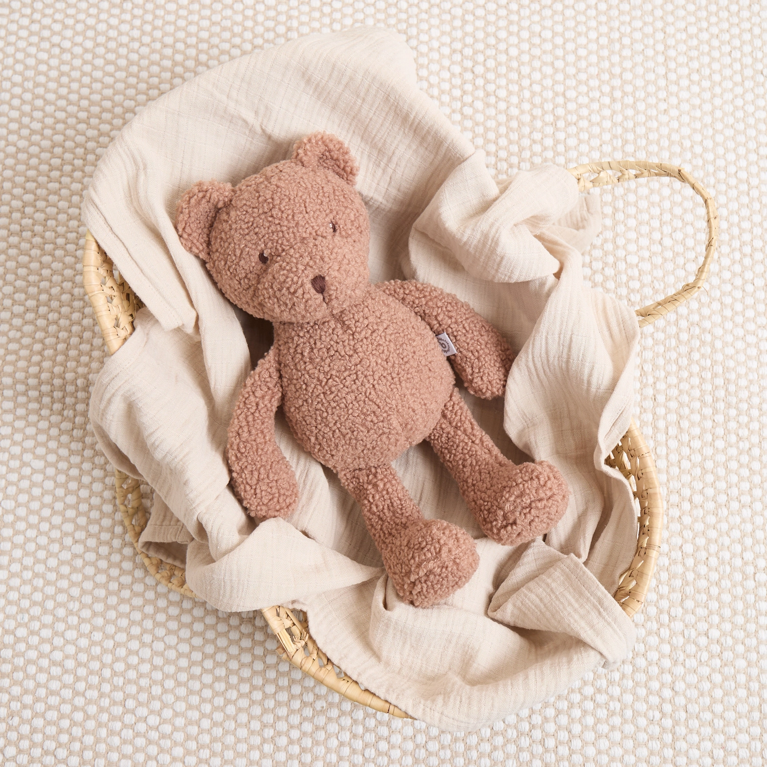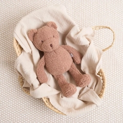 Miś Mika to klasyczny pluszowy przyjaciel z nutą nostalgii, który nigdy nie wychodzi z mody. Puszysta tkanina bouclé w czekoladowym kolorze zachęca do tulenia, a jego miękkie wypełnienie zapewnia wsparcie podczas odpoczynku i zasypiania. Dzięki dłuższym, swobodnie zwisającym kończynom jest przyjemnie elastyczny i wygodnie wtula się w ramiona.