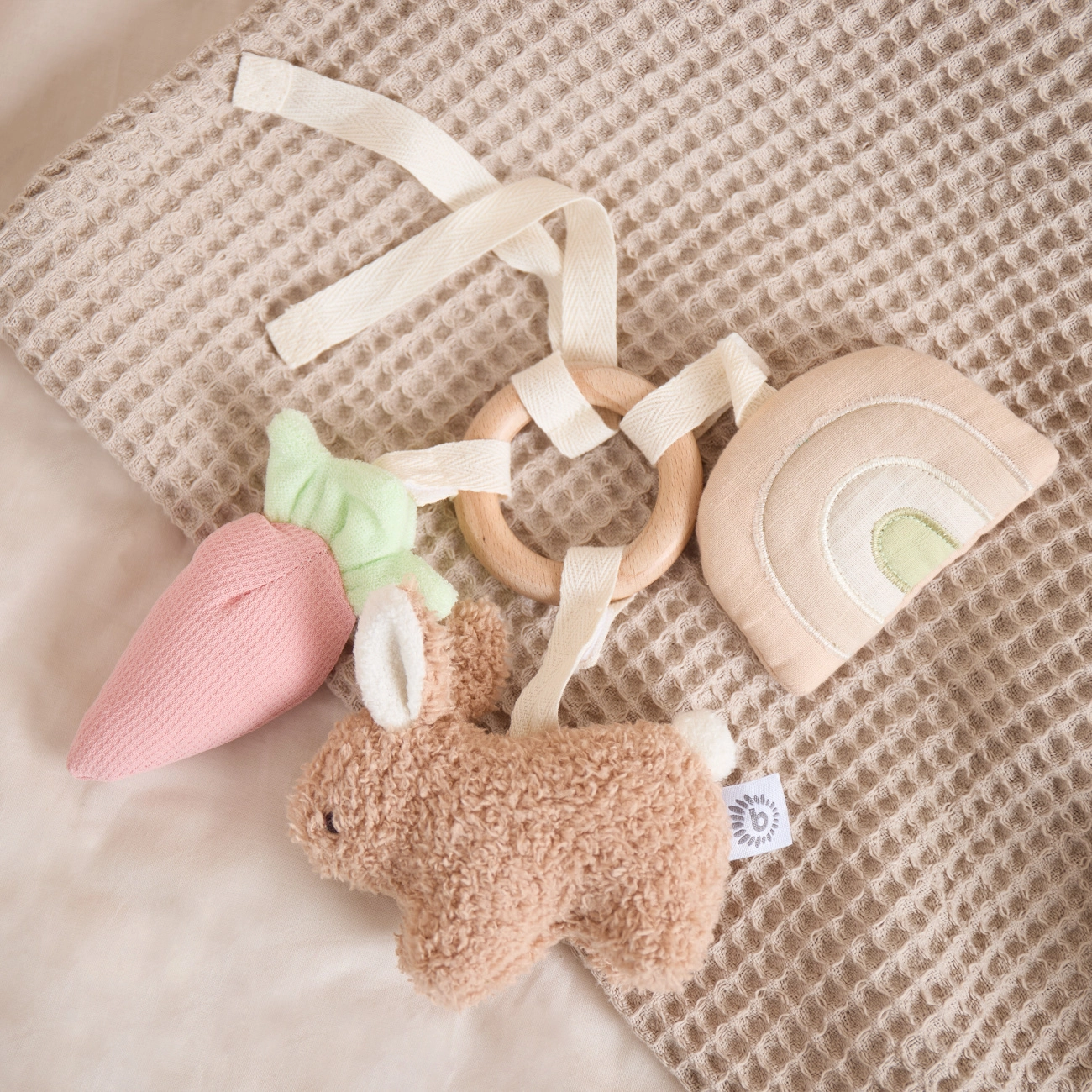 Drewniany krążek, tęcza z lusterkiem, marchewka z piszczałką i szeleszczącą folią, królik z grzechotką i szeleszczącą folią