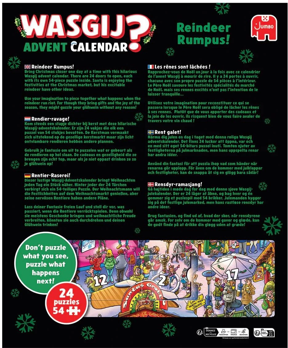 Uczyń oczekiwanie na Wigilię jeszcze przyjemniejszym dzięki kalendarzowi adwentowemu WASGIJ: Spłoszone renifery! Ten kalendarz oferuje unikalną koncepcję, w której końcowy obraz nie jest zgodny z tym na opakowaniu. Szukasz wskazówek, uruchamiasz wyobraźnię i układasz scenę z innej perspektywy. Idealny prezent dla miłośników puzzli oraz doświadczonych układaczy, którzy chcą spróbować czegoś nowego.