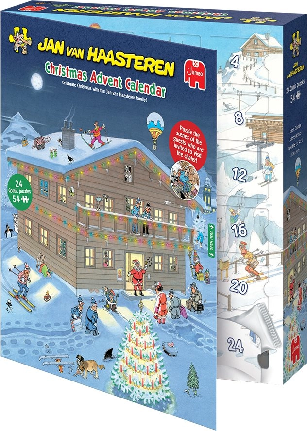 Umil oczekiwanie na Święta dzięki kalendarzowi adwentowemu JUMBO. Każde okienko skrywa oddzielne mini puzzle w charakterystycznym stylu JAN VAN HAASTEREN – kolorowe, pełne detali i przede wszystkim zabawne ilustracje, które rozbawią całą rodzinę.