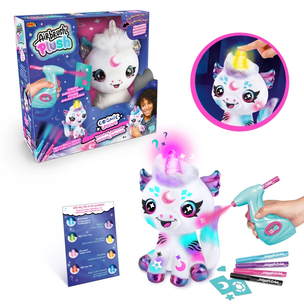 Odkryj magię tworzenia z wyjątkowym zestawem Airbrush studio – kosmiczny jednorożec. W opakowaniu znajdziesz pluszowego przyjaciela, narzędzie airbrush, 4 kolorowe wkłady oraz 100 szablonów do nieskończonych kombinacji wzorów. Łatwo zmywalne farby pozwalają tworzyć raz po raz, a świecący magiczny róg dodaje interaktywnej zabawy z odpowiedziami tak/nie. Idealny kreatywny prezent dla dzieci od 6 lat.