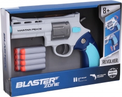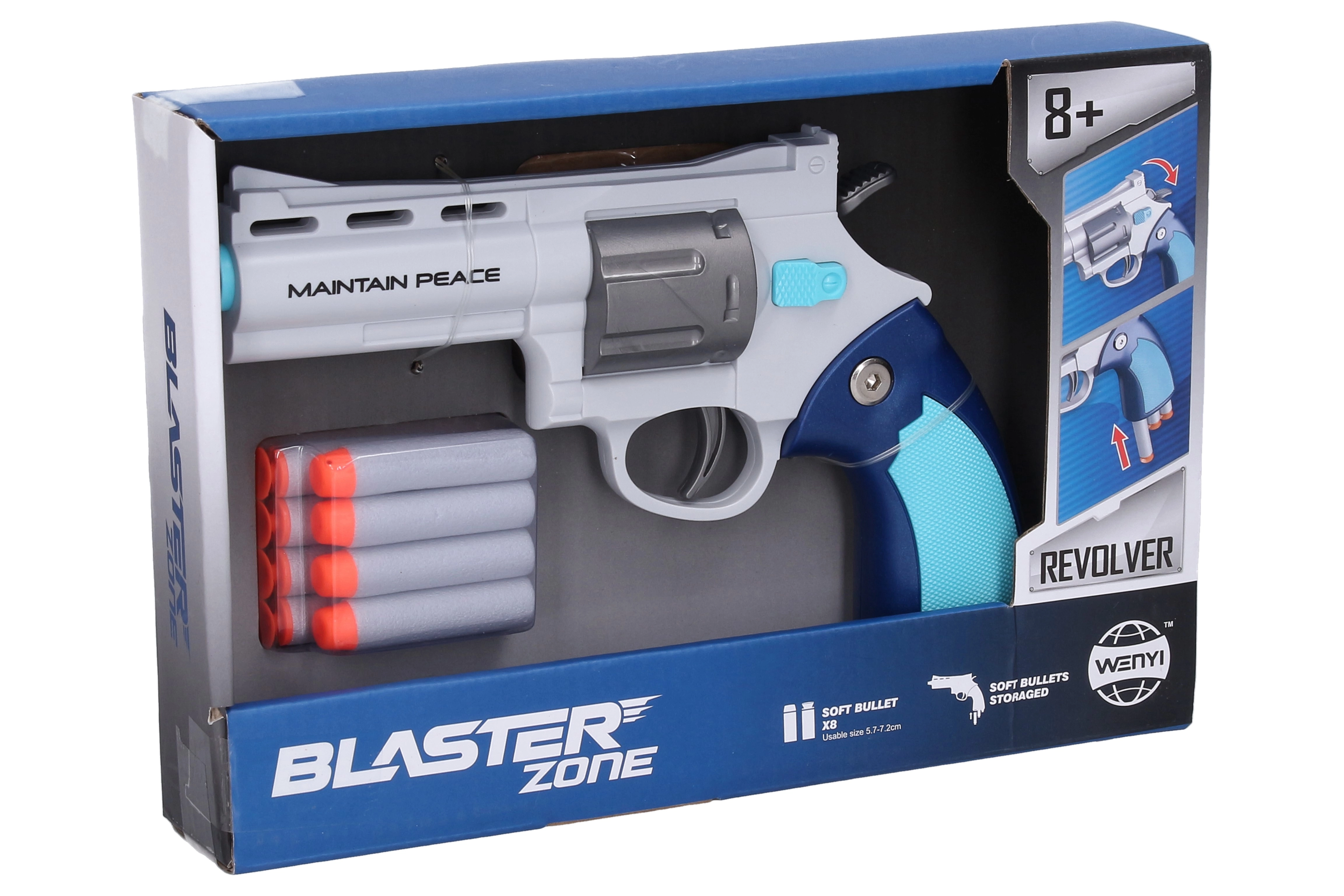 Zabawna i bezpieczna zabawa w strzelca z piankowym rewolwerem o długości 22,5 cm. W zestawie znajduje się 8 piankowych naboi (4 standardowe i 4 z przyssawką) do różnych typów zabawy. Prosta obsługa – włóż nabój do lufy, napnij kurek i naciśnij spust. Praktyczna półka na naboje znajduje się na spodzie rękojeści.