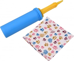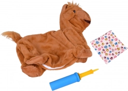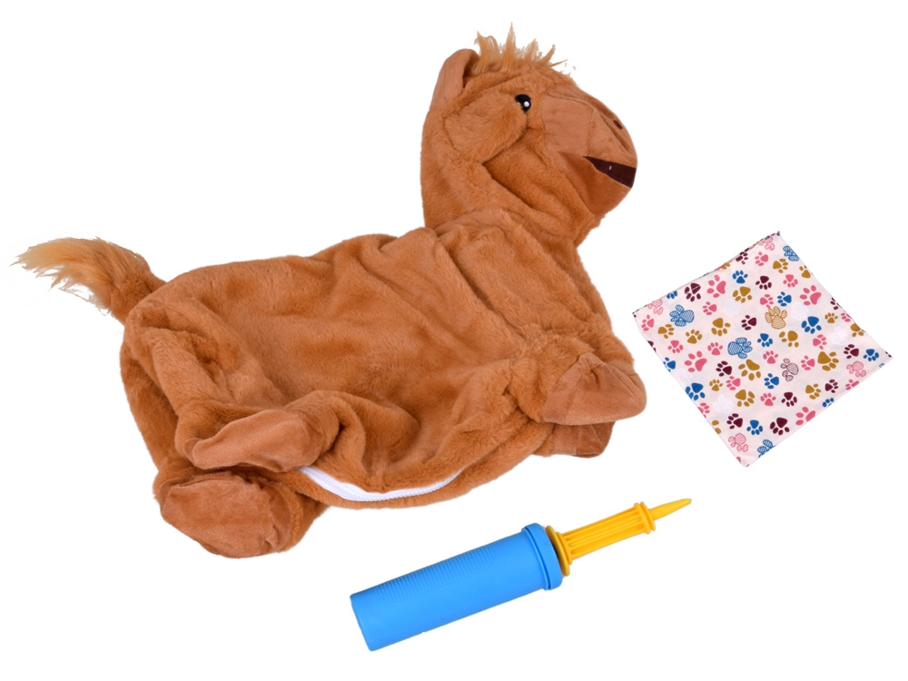Skaczący byczek jest przyjemnie miękki w dotyku, ma bezpiecznie haftowane oczy, małe rogi i puszysty ogonek. Wystarczy rozpiąć suwak na brzuszku, włożyć i nadmuchać za pomocą dołączonej pompki – w kilka chwil jest gotowy na przygodę. Chustka z wesołym nadrukiem łapek nadaje mu oryginalny wygląd, który dzieci uwielbiają.