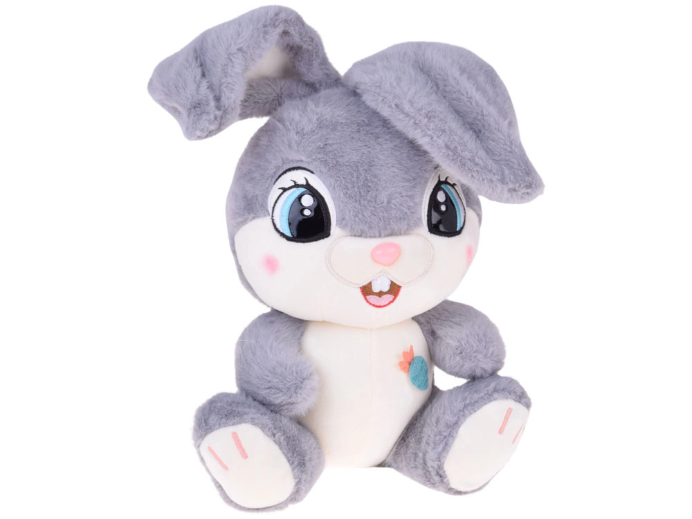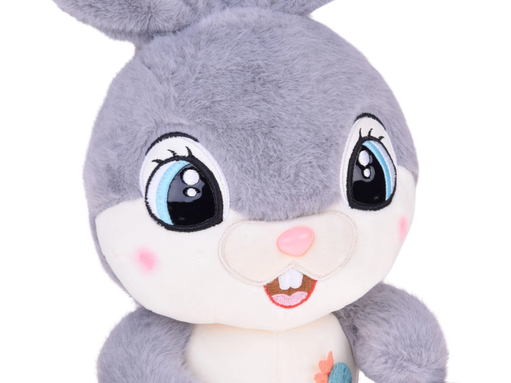 Uroczy pluszowy króliczek o wysokości 40 cm wykonany z niesamowicie miękkiego i przyjemnego w dotyku materiału w szarosrebrnym odcieniu z kremowym brzuszkiem. Ma giętkie długie uszka, uroczy nosek oraz bezpieczne haftowane detale. Idealny do przytulania, jako uspokajający towarzysz i stylowa dekoracja do pokoju dziecięcego.