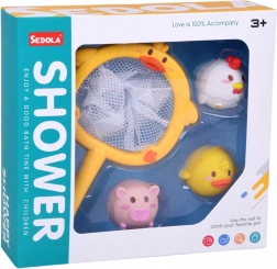 Ten uroczy zestaw do kąpieli zamieni każdą kąpiel w świetną zabawę. Dzieci mogą za pomocą siateczki w kształcie kaczuszki łowić pływające zwierzątka i ćwiczyć motorykę małą, koordynację ręka–oko oraz cierpliwość. Przyssawka na rączce pozwala przymocować siateczkę do gładkiej powierzchni wanny lub płytek, dzięki czemu zabawki po kąpieli łatwo schną i pozostają przejrzyście uporządkowane.