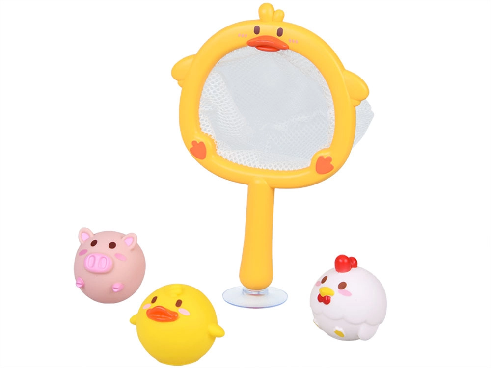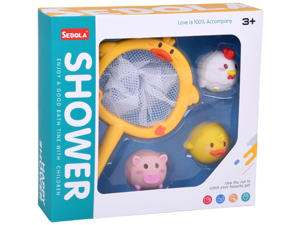 Umilij dzieciom czas w wannie dzięki zabawnemu zestawowi do łowienia zwierzątek. Zawiera siateczkę w kształcie kaczuszki z przyssawką oraz trzy mięciutkie zwierzątka – kaczkę, świnkę i kurkę. Dzięki bezpiecznym, zaokrąglonym kształtom, materiałowi bez ostrych krawędzi oraz zwierzątkom bez dziurki zabawa jest higieniczna i łatwa do utrzymania w czystości.