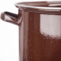 Duży emaliowany garnek o pojemności 15 litrów w eleganckim brązowym kolorze jest idealny do gotowania i duszenia w większych ilościach. Ma średnicę 36 cm, wysokość 19,5 cm i dzięki wygodnym uchwytom łatwo się przenosi. Nadaje się na kuchenki gazowe, elektryczne, ceramiczne, halogenowe i indukcyjne oraz można go myć w zmywarce.