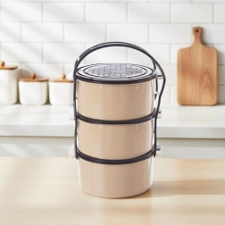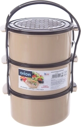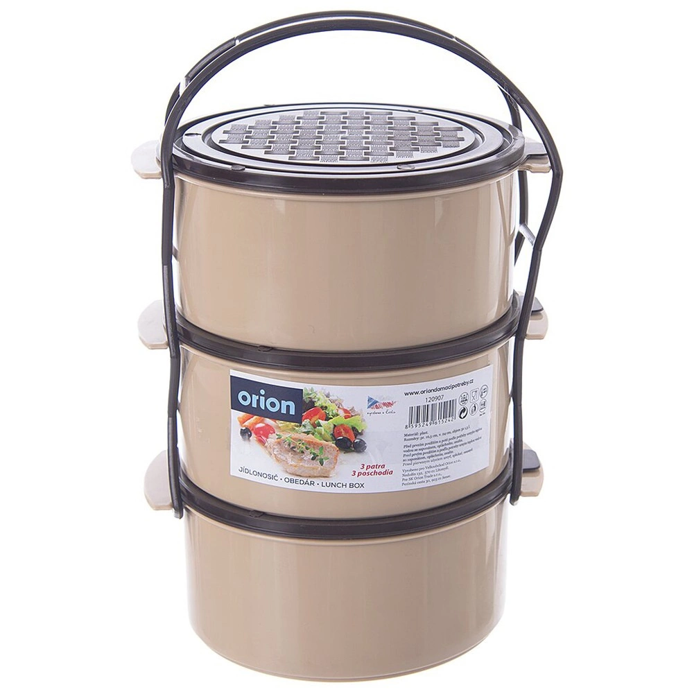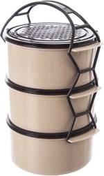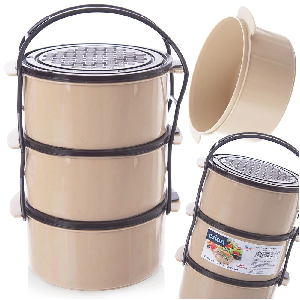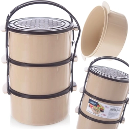 Praktyczny trójpoziomowy pojemnik na jedzenie o pojemności 3 × 1,5 l utrzyma Twoje potrawy przejrzyście oddzielone i bezpieczne w transporcie. Solidna rama z uchwytem do przenoszenia, osobne pokrywki do każdego pojemnika oraz wytrzymałe plastikowe wykonanie w beżowo–brązowej kolorystyce zapewniają łatwe użytkowanie w domu i w podróży. Nadaje się do zmywarki, lodówki, zamrażarki oraz do mikrofalówki bez pokrywek.