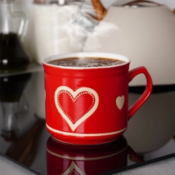 Duży ceramiczny kubek o pojemności 650 ml w czerwonym kolorze ze stylowym motywem serc jest idealny do codziennego picia kawy lub herbaty. Ma wygodne ucho, płaskie dno dla stabilności i łatwego podgrzewania, jest odpowiedni do mikrofalówki i zmywarki, a także cieszy jako dekoracyjny element kuchni.
