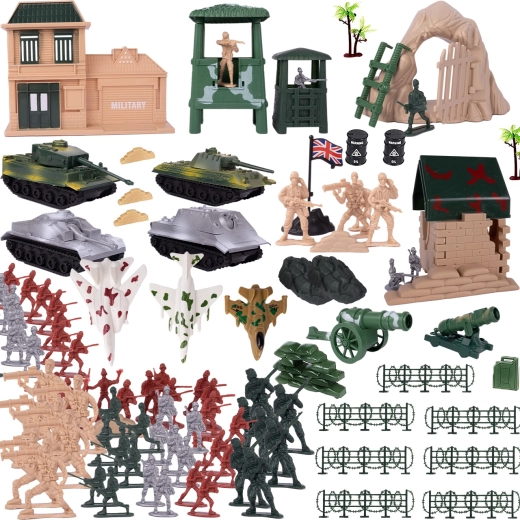 - Kompletny zestaw wojskowy: figurki, pojazdy, przeszkody i budowle