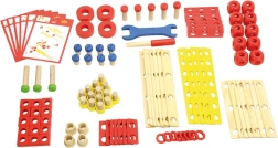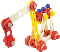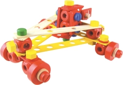 Kolorowe i naturalne listewki, śruby, nakrętki, koła i łączniki pozwalają dzieciom składać pojazdy oraz fantazyjne konstrukcje i wielokrotnie je przebudowywać.