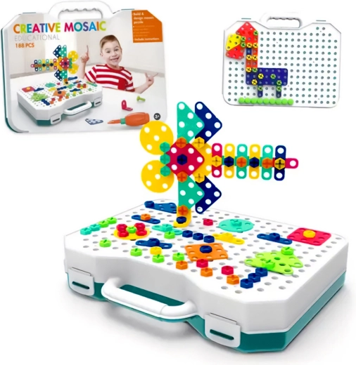 Ten kolorowy zestaw oferuje szeroką gamę kształtów do układania oryginalnych konstrukcji. Praktyczna walizka o wymiarach 30 × 23,5 × 11 cm umożliwia łatwe przenoszenie i przechowywanie wszystkich elementów, dzięki czemu porządek i zabawa są zawsze pod ręką.