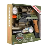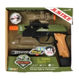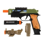 Realistycznie wyglądający plastikowy pistolet dla małych miłośników gier akcji. Oferuje efekty świetlne, efekty dźwiękowe oraz praktyczne akcesoria, takie jak celownik, latarka i tłumik. Działa na baterie, które są częścią zestawu.