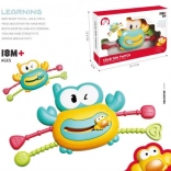 Sensoryczna zabawka w kształcie kraba została zaprojektowana dla dzieci od 18 miesięcy. Łączy bodźce wzrokowe z stymulacją dotykową i oferuje szerokie możliwości odkrywania. Kolorowe sznurki do przeciągania, elementy obrotowe oraz koraliki do przesuwania wspierają rozwój motoryki małej, myślenia logicznego i koordynacji ręka-oko. Mały krabik na sznurku dodatkowo po pociągnięciu porusza oczami większego kraba, co sprawia dzieciom radość i pobudza ich ciekawość.