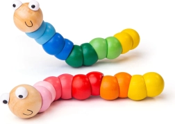 Ten kolorowy robaczek to idealna pierwsza zabawka motoryczna dla małych rączek. Dzięki gładkim drewnianym segmentom i bezpiecznym połączeniom dzieci łatwo go chwytają, obracają i wyginają – ćwicząc chwyt, koordynację oko–ręka oraz koncentrację. Wesołe kolory przyciągają uwagę i zachęcają do ciekawskiej zabawy.