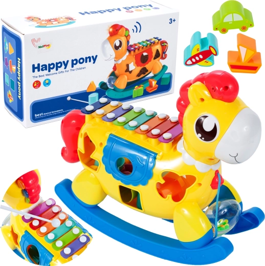 Zabawna zabawka 3 w 1 dla najmłodszych: koń na biegunach, sorter kształtów i mini talerzyki. Po obróceniu ogonka z ukrytymi koralikami rozlega się przyjemny grzechot, który wspiera rozwój słuchu. Świetny wybór dla dzieci od 3 lat, rozwija motorykę, koordynację i kreatywność.