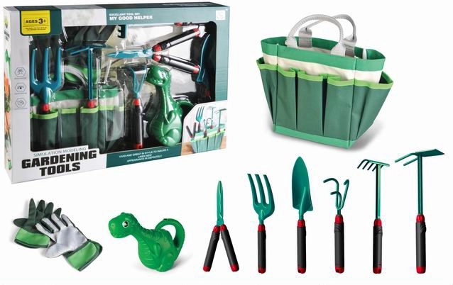 - Kompletne wyposażenie: konewka, nożyce, grabki, łopatka, motyczka, mały spulchniacz, rękawice