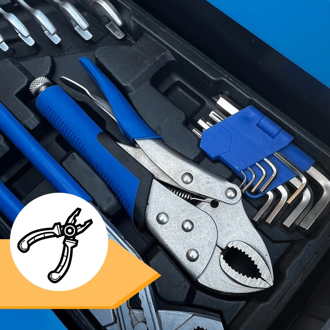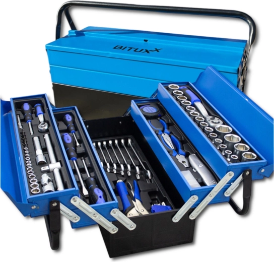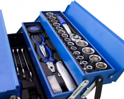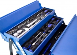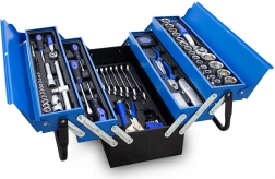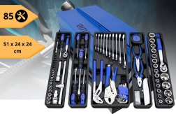 Praktyczny i przejrzysty zestaw narzędzi z 85 elementami w wytrzymałej metalowej rozkładanej walizce. Znajdziesz w nim grzechotki 1/4" i 1/2", bogaty zestaw nasadek, śrubokręty, klucze płasko-oczkowe, szczypce oraz klucze imbusowe – wszystko umieszczone w zorganizowanych wkładkach dla szybkiego dostępu. Idealny do warsztatu, garażu i domowych napraw.