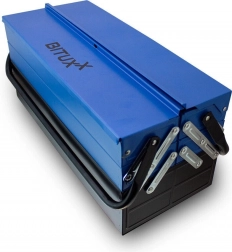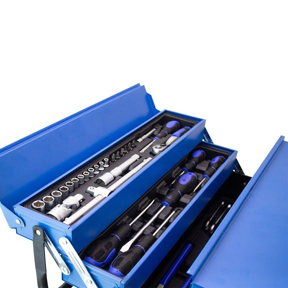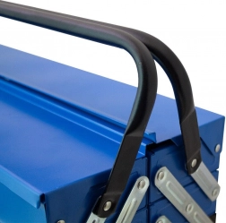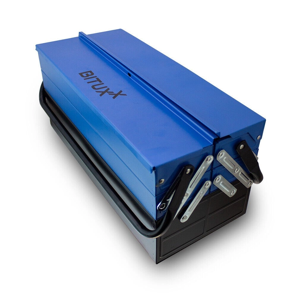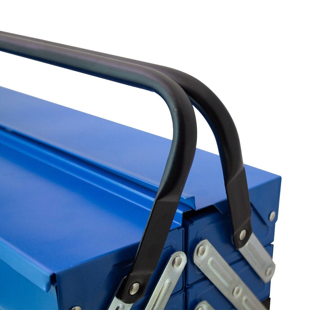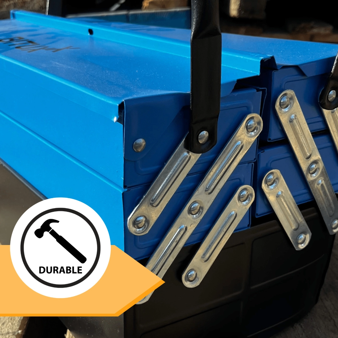 Solidna metalowa skrzynka z wielokrotnie składanymi poziomami i wytrzymałymi uchwytami zapewnia trwałość, ochronę narzędzi i wygodną mobilność.
