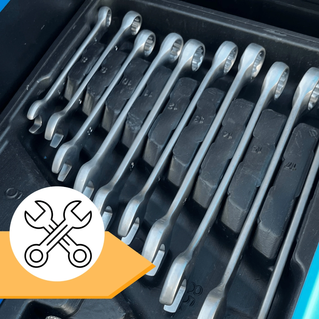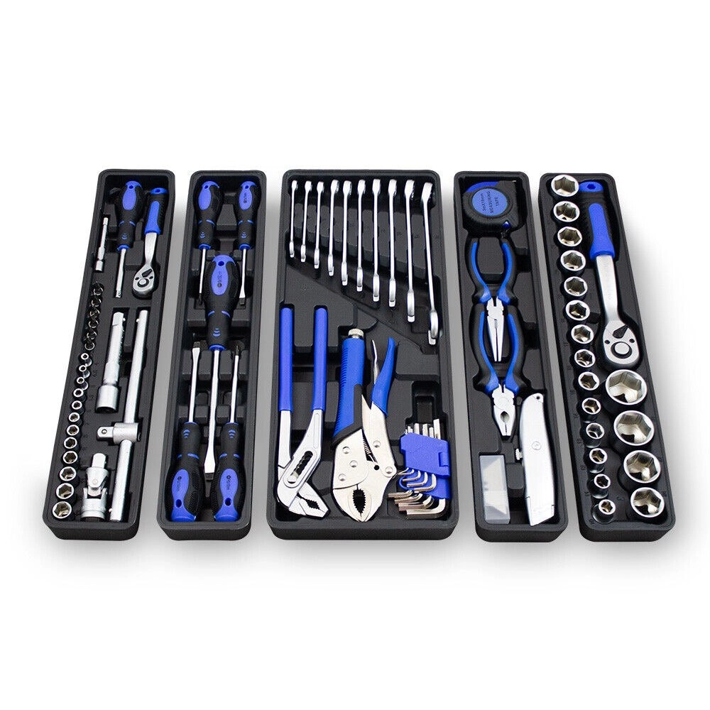 Grzechotki 1/4" i 1/2", szeroki zestaw nasadek, śrubokręty, imbusy, klucze płasko-oczkowe i szczypce – wszystko w jednym kompaktowym secie.