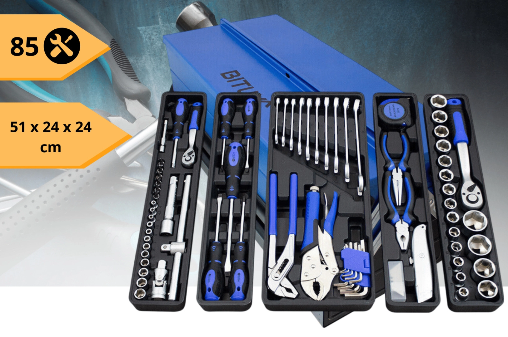 Zestaw narzędzi 85 elementów w metalowej rozkładanej walizce
