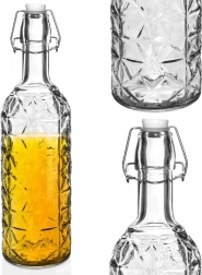 Stylowa szklana butelka o pojemności 750 ml z zamknięciem patentowym i silikonową uszczelką do bezpiecznego i szczelnego przechowywania napojów. Dzięki wysokiej jakości grubemu szkłu oraz dekoracyjnemu reliefowi doskonale nadaje się do domowej lemoniady, wina, likierów czy syropów. Wielokrotnego użytku, praktyczna, a jednocześnie dekoracyjna karafka do każdej kuchni.