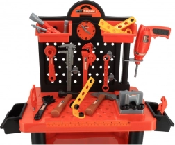 - 1× wiertarka, 2× młotek, 1× dwustronny klucz oczkowy, 1× piła ramowa, 1× piłka, 1× śrubokręt z wymienną końcówką, 1× klucz nasadowy, 1× suwmiarka, 2× klucz francuski, 1× szczypce, haczyki do zawieszania narzędzi, naklejki i inne akcesoria