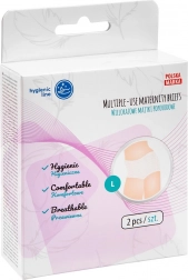 Praktyczne poporodowe majtki AKUKU do wielokrotnego użytku w rozmiarze L oferują wysoki komfort, oddychalność i higieniczne noszenie po porodzie. Dzięki siatce zapewniają swobodny przepływ powietrza, mają delikatną gumkę w pasie i nogawkach i nadają się do prania. Opakowanie zawiera 2 sztuki w kolorze białym.