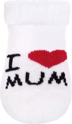 Te białe skarpetki frotte dla niemowląt łączą solidne wykonanie, wygodę i uroczy design z motywami I ♥ MUM / I ♥ DAD. Miękki i ciepły materiał frotte jest łagodny dla wrażliwej skóry i utrzymuje stópki w cieple nawet w chłodniejsze dni.