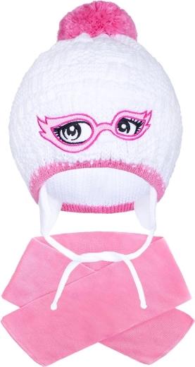 Ciepła zimowa czapka dla dzieci w kolorze różowym z dopasowanym szalikiem jest idealna na chłodne dni. Wygodna dzianinowa podszewka i wiązanie pod brodą sprawiają, że czapka doskonale się trzyma i chroni przed zimnem. Stylowy motyw maski oraz pompon dodają figlarnego wyglądu, który dzieci pokochają.