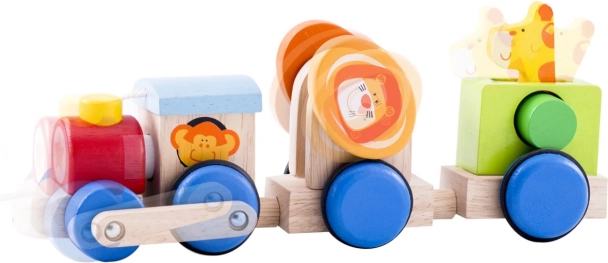 Pociąg wykonany jest z wytrzymałego litego drewna, co gwarantuje długą trwałość. Elementem projektu są piękne ilustracje zwierząt i żywe połączenia kolorów, które przyciągają uwagę i czynią zabawę jeszcze bardziej angażującą.