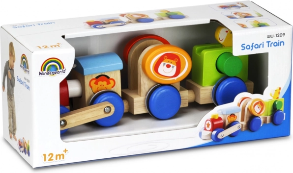 Pociąg safari z wytrzymałego drewna, łączący żywe kolory i zabawne ilustracje, pomaga rozwijać u dzieci motorykę dużą i zachęca je do ruchu podczas zabawy.