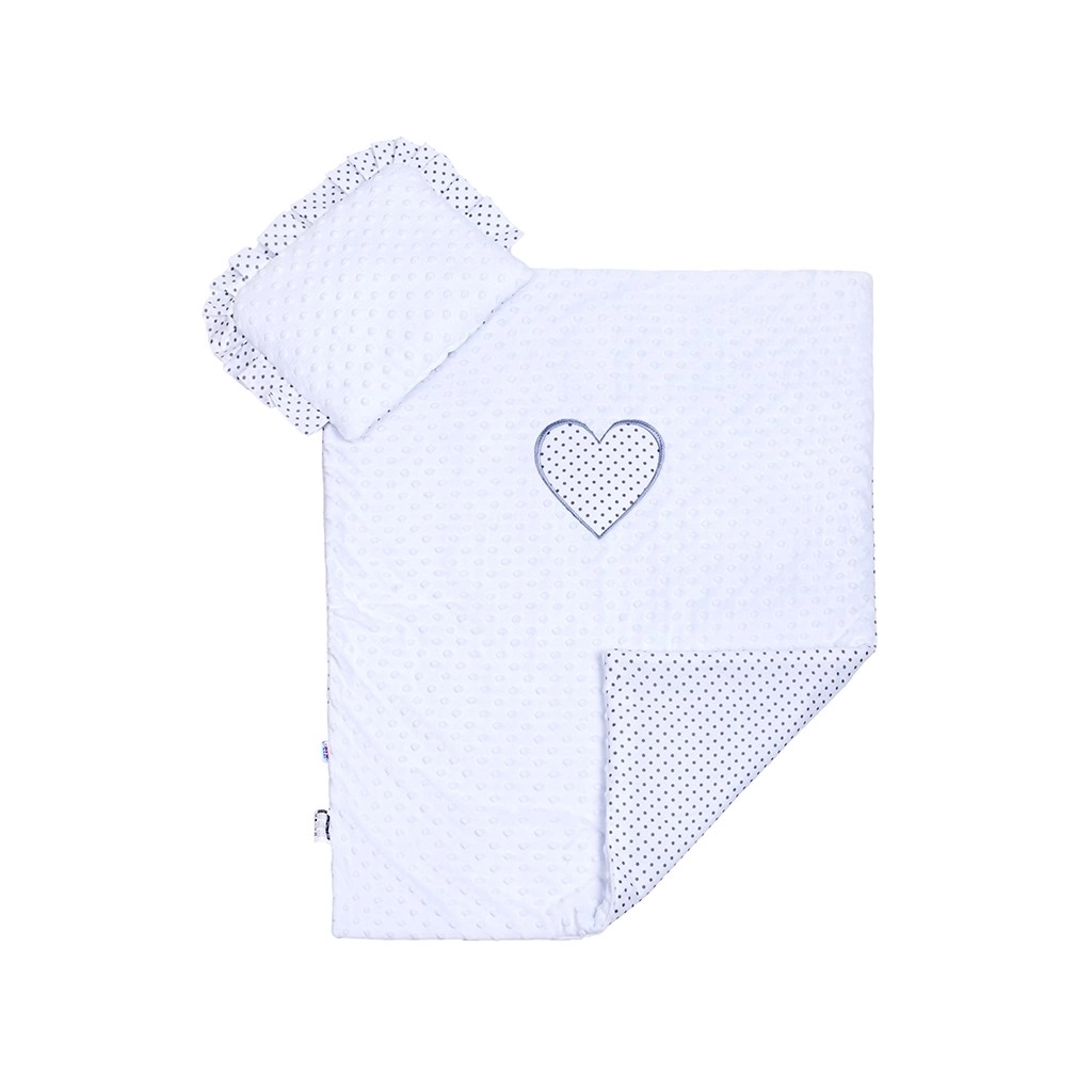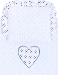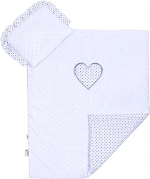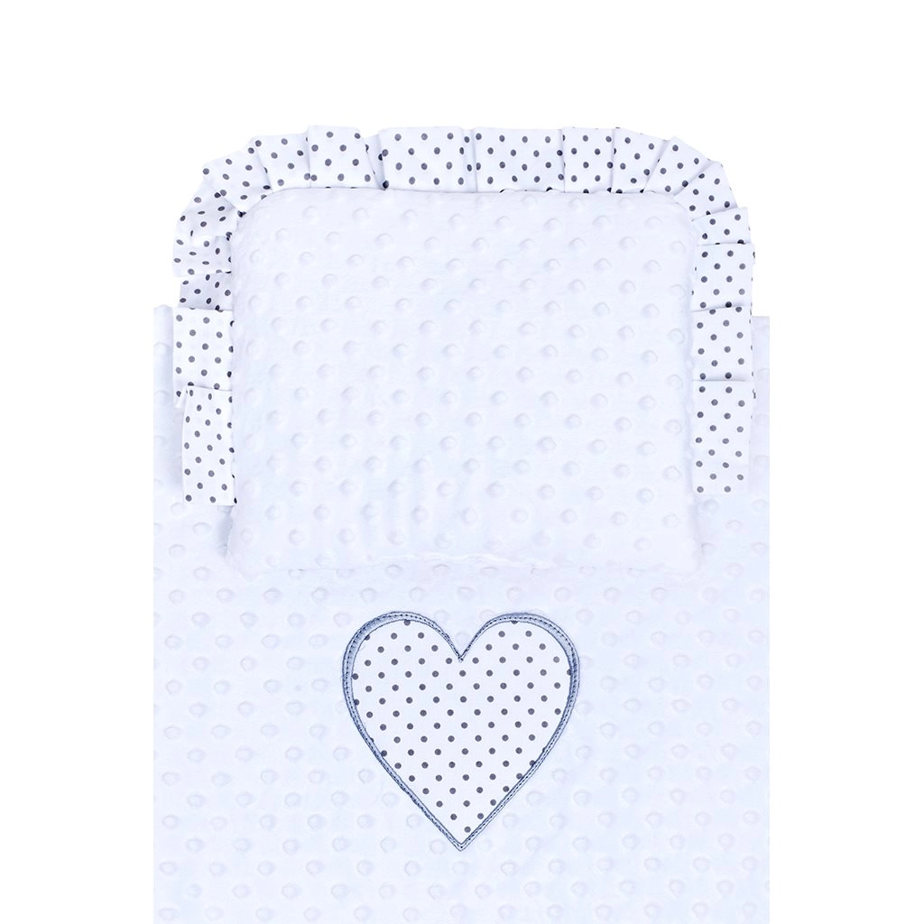 Elegancki biały zestaw pościeli do wózka z minky i bawełny został zaprojektowany z myślą o wrażliwej skórze dziecka. Miękka powierzchnia minky z wypukłymi kropeczkami grzeje i koi, bawełniana strona z całopowierzchniowym nadrukiem w kropki jest przyjemna i oddychająca. Kołderkę zdobi duże serduszko w kropki, poduszeczka ma delikatną falbankę – pięknie dopełni każdy wózek i łóżeczko.