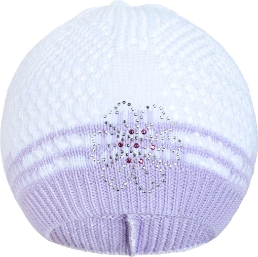 Stylowa, dzianinowa czapeczka NEW BABY w eleganckim fioletowym kolorze ozdobiona jest delikatnym kwiatkiem z błyszczącymi kamyczkami. Dzięki naturalnemu składowi jest miękka dla dziecięcej skóry, dobrze oddycha i jednocześnie trzyma kształt.