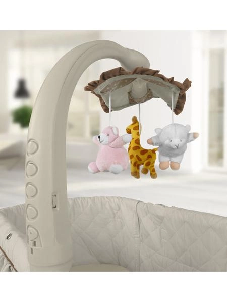 Zintegrowana karuzela z pluszowymi zabawkami oferuje melodie, lampkę nocną i delikatne wibracje. Głośność i intensywność światła łatwo wyregulujesz, a całość obsłużysz także pilotem.