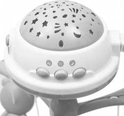 Ta elegancka, szara karuzela nad łóżeczko BABY MIX zapewnia dziecku stymulację wzrokową i słuchową, a jednocześnie delikatnie je wycisza przed snem. Zintegrowany projektor świetlny z gwiazdkami zmienia kolory i może pełnić funkcję lampki nocnej, która ociepla atmosferę dziecięcego pokoju.
