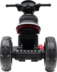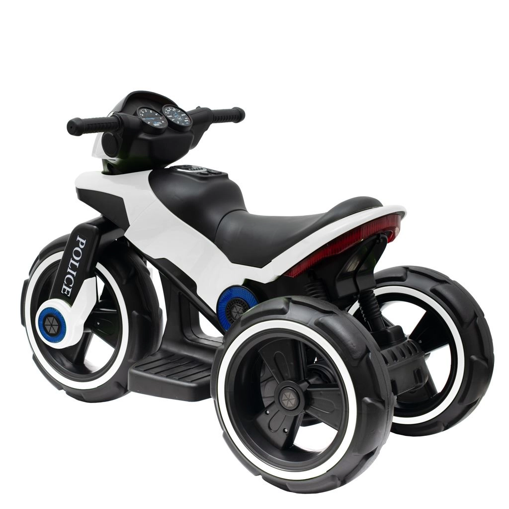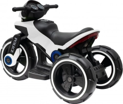 Dziecięcy motocykl elektryczny BABY MIX Police łączy realistyczny wygląd, komfort i bezpieczeństwo. Dzięki dwóm mocnym silnikom oraz napędowi obu tylnych kół dzieci cieszą się stabilną jazdą z prędkością 2–4 km/h. Obsługa jest intuicyjna – pedał na podnóżku do ruszania i automatyczne zatrzymanie po jego zwolnieniu, kierunek jazdy zmienisz przyciskiem.