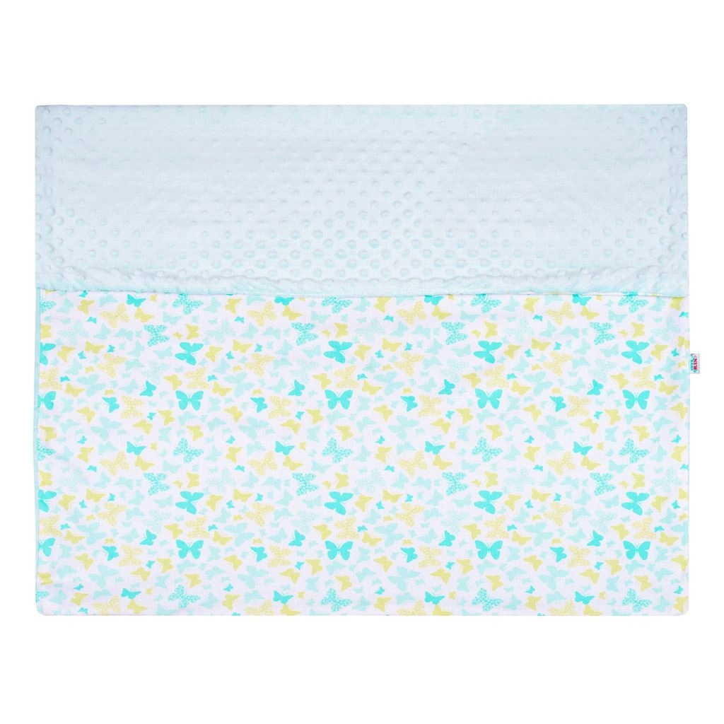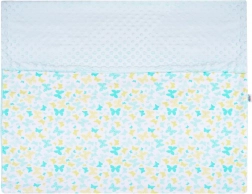 Ten dwustronny kocyk dziecięcy New Baby łączy komfort i funkcjonalność do codziennego użytku. Strona z minky w subtelnym, niebieskim kolorze z wypukłymi kropkami zapewnia stymulację dotykową i przytulne ciepło, natomiast bawełniana strona z radosnym nadrukiem jest przewiewna i delikatna dla skóry maluszka.