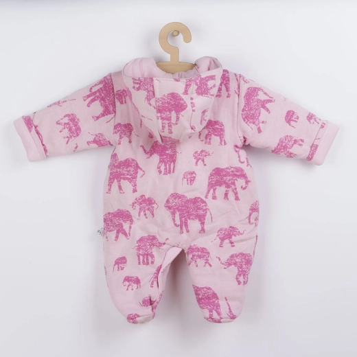 Uroczy i praktyczny ocieplony kombinezon dla niemowląt z kapturem i nadrukiem słoni. Oferuje miękki, ciepły komfort, pełne boczne zapięcie na napy dla łatwego ubierania oraz antyalergiczną wypełnienie delikatną dla wrażliwej skóry. Wyprodukowany w Czechach z wysokiej jakości materiałów z bawełnianą podszewką.